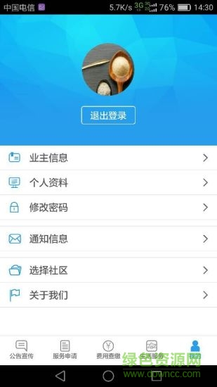 业主消息、个人资料、密码、通知消息、选择社区、关于我们。