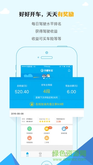 手机车宝app是一款专注于手机记录车主驾驶信息的软件,只要好好开车就会获得一定的奖励,平台会根据记录的信息对车主的驾驶行为进行打分,车主从而获得驾驶收益,同时也帮用户改正了驾驶时的不良习惯。有需要的朋友可以来绿色资源网下载使用。