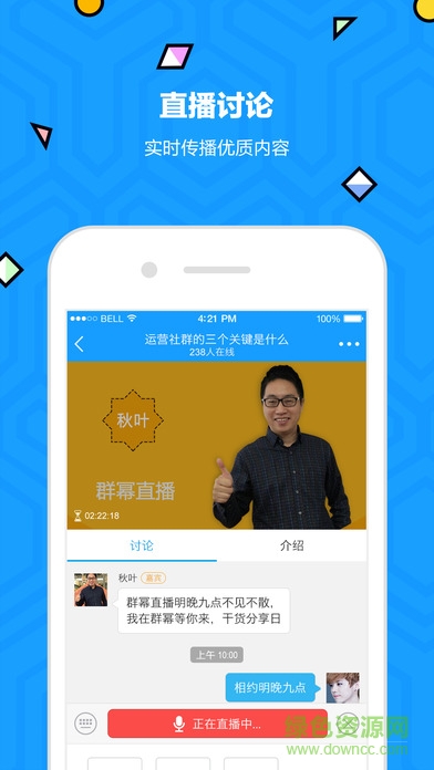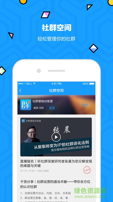 群幂苹果版是一款社交聊天类应用,是专为广大社群推出的,满足其优质内容要分享和提高成员互动的需求,具有发起音频、视频直播、设置直播模式、课程回顾、打赏、讨论、提问、献花等在线功能,成为了社群方便快捷的内容变现入口.喜欢的朋友可以来绿色资源网下载使用!