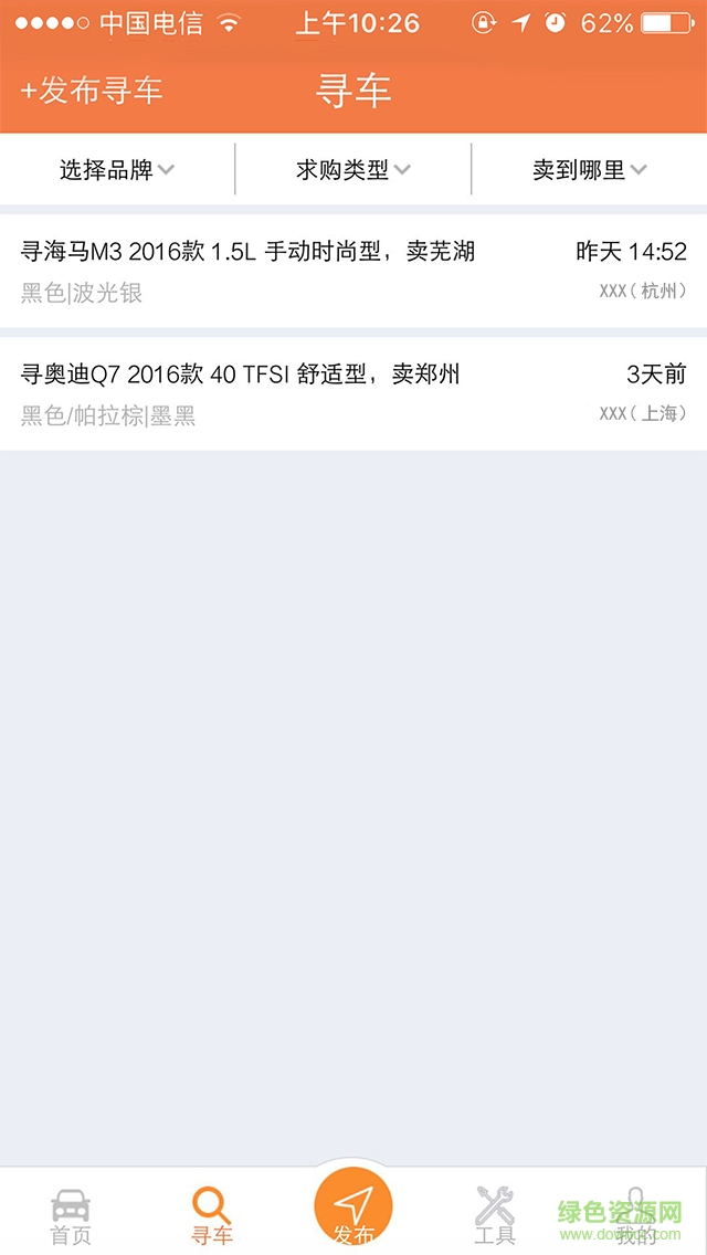 寻车界面实现了排序功能,用户根据价格,车源商信誉值进行排序,还可对汽车品牌、特价、进口车等实现筛选功能;