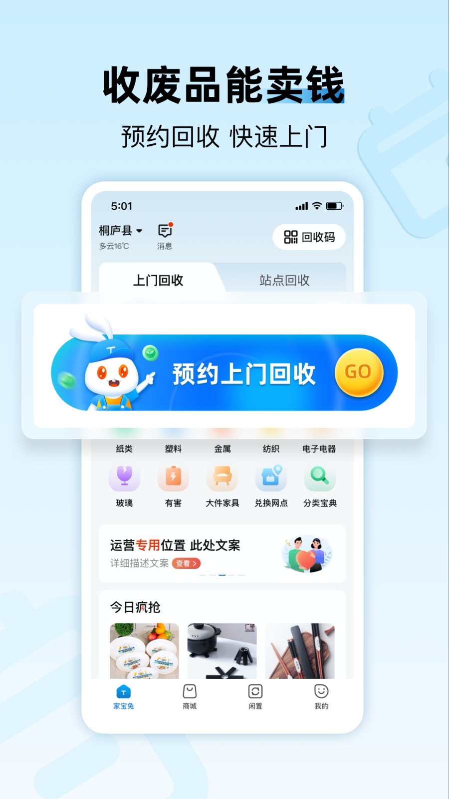 变废为宝就在家宝,家宝兔app是一款方便居民回收废品的互联网+再生资源回收利用的软件,每个用户都能分配到他专属的二维码,依靠这个二维码,用户可以便捷的进行废品回收、大件上门等,所获得的积分还可以在商场中兑换价廉物美的商品。