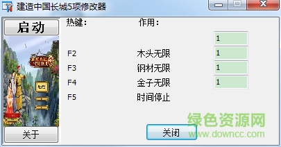 建造中国长城五项修改器是一款功能强大的游戏修改器,使用修改器玩家可以一键修改游戏中各项重要属性,轻松达到无限食物、无限金币等功能,需要的朋友欢迎来绿色资源网下载!