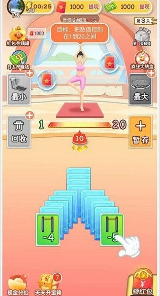 体重大闯关是减肥健身类的游戏。我们可以通过闯关的方式来获取红包奖励。通过减少体重来赚红包券,当收入的红包券价值高于三毛钱时,点击游戏内的提现按钮,红包券会以现金的方式到账微信零钱。
