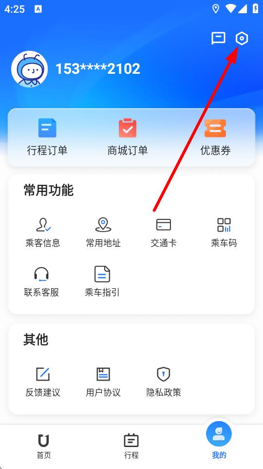 1、打开优点出行APP,进入我的页面,点击右上角设置图标。