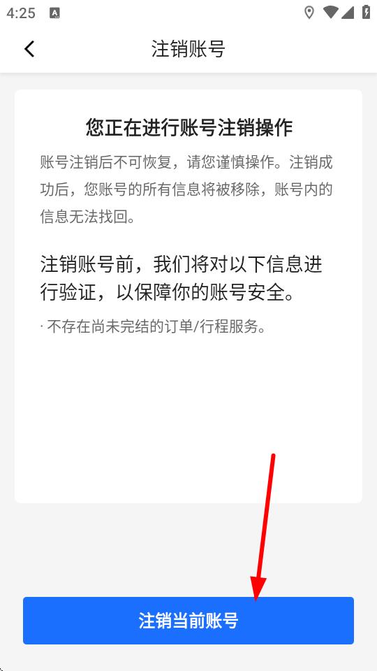 4、在注销账号提示页面,仔细阅读账号注销说明及验证要求,确认后点击注销当前账号按钮,按照提示完成后续操作。