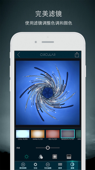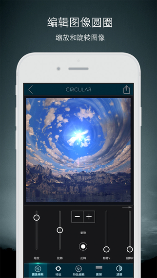球形全景Circular,是一款有趣的照片编辑神器!可将你的照片变成精美的圆形特效图像,有趣好玩,拥有强大的新功能,是一款你前所未见的新品应用。可轻松缩放圆形图像直至完美,在满意后,可给图像添加专业特效,如镜头光晕和天体(太阳、月亮、星球、鸟儿等等)。另一个很酷的功能是拥有一系列"中心源"物体,包括球体、星球、几何形状,可放在图像圆的中心,将图像变成一个迷你世界。