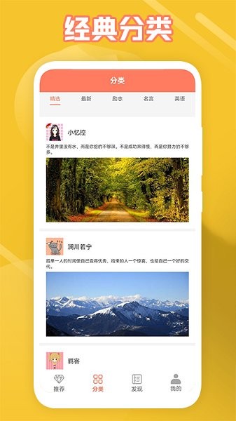 爱上阅读给人的感觉就是一种简约美,整个界面看起来井然有序,语录分类齐全,素材更新快,可以满足日常所有的文案需求,也能像心思细腻的挚友治愈心灵给人力量。界面简洁,不论是积累文案素材还是日常语录,都很实用,适合所有人群。爱上阅读,感受阅读之美。