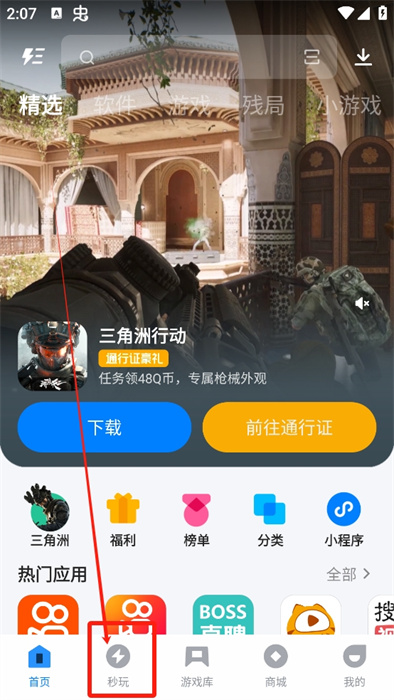 1、打开应用宝,在其中点击下方的【秒玩】栏目,点击切换到该界面;