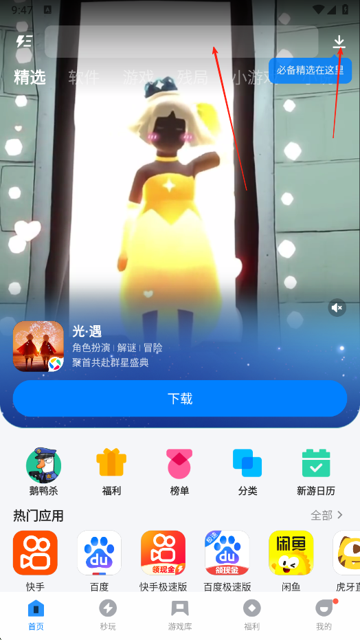 1、打开应用宝,在首页看到喜欢的应用如光·遇,点击下方蓝色下载按钮,即可开始下载该应用,同时也能浏览热门应用推荐。