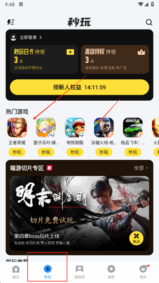 2、点击底部秒玩选项,进入秒玩页面,可看到热门游戏如王者荣耀,蛋仔派对等,点击游戏下方秒玩按钮,就能快速体验游戏。