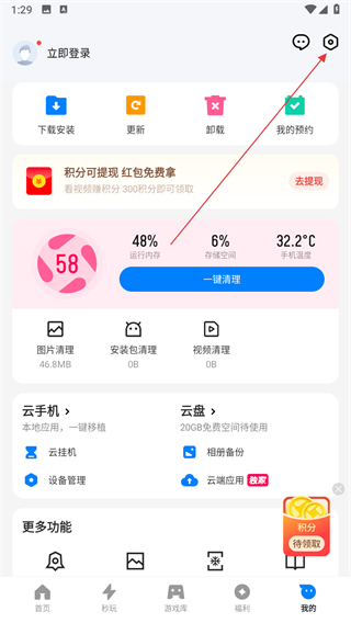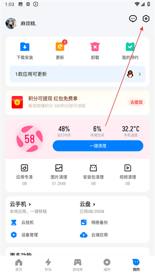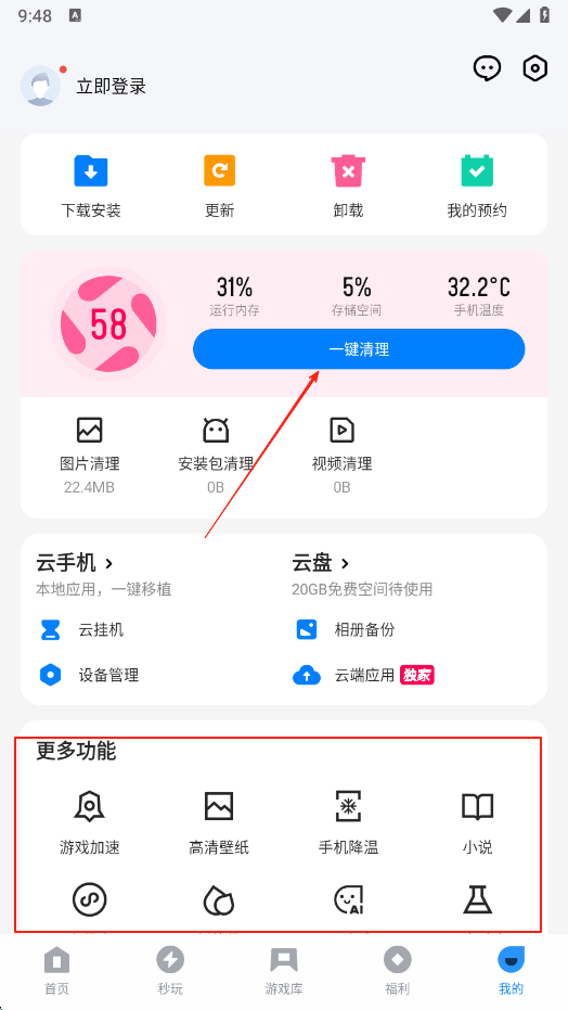3、点击底部我的选项,进入个人页面,看到一键清理按钮,点击该按钮,可对运行内存、存储空间等进行清理,也能在更多功能里使用游戏加速、手机降温等功能。