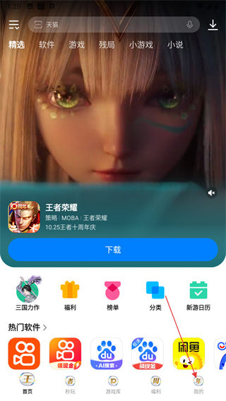 1、打开应用宝,点击底部导航栏我的选项,即可进入个人页面。