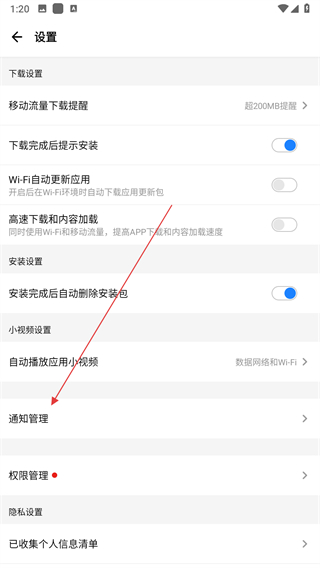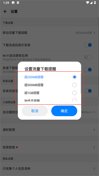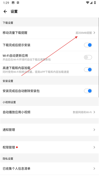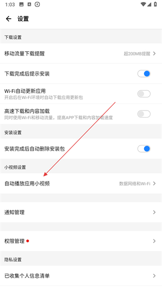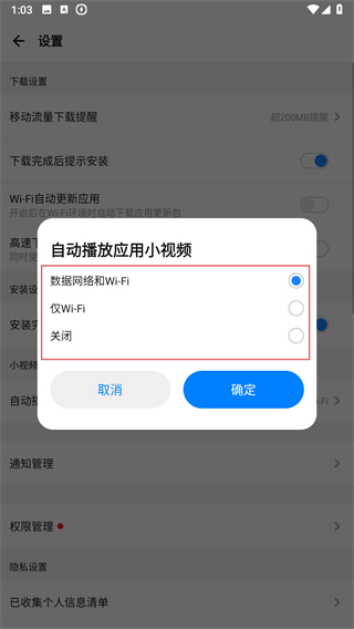 3、在设置界面里,找到自动播放应用小视频选项并点击,弹出选择窗口。