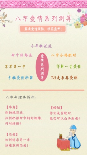 6、恋爱婚姻:涵盖桃花,爱情,结婚,找到属于自己的幸福!解决感情烦恼,桃花盛开。