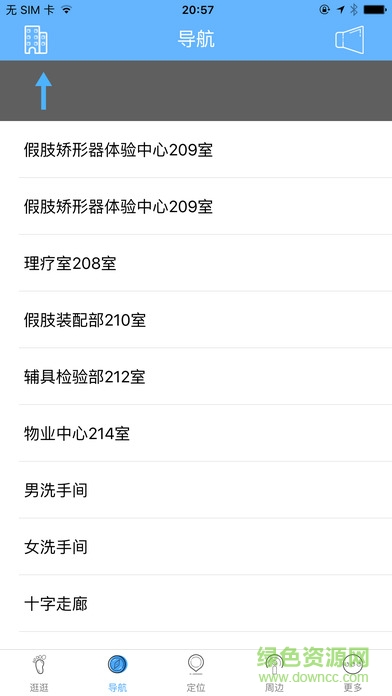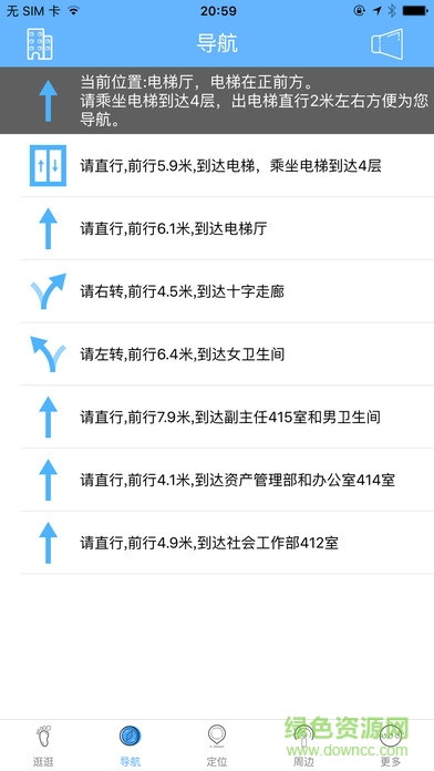 导航:默认显示第一层房间列表。在检测到有效信号时,显示信号所在楼层房间列表。在一级或多级界面选择目的地后,自动规划出最短路径进行导航列表显示和语音导航。在导航过程中会伴随列表跟随和方向提示,用户偏离导航路线时,会重新规划到达目的地的最短路线;