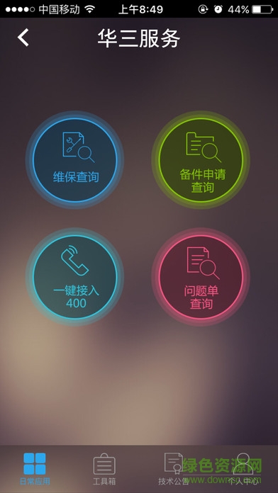 华三服务手机客户端是一款方便合作伙伴工程师与H3C进行互动,并便捷解决问题的工具,其核心功能“一键接入400”,更是提高了合作伙伴工程师的问题解决效率。华三服务APP包括“日常应用”、“工具箱”、“案例公告”、“个人中心”四大模块。