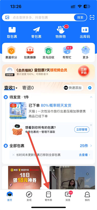 1、在菜鸟应用界面,点击底部导航栏的寄件券选项,进入对应的菜鸟裹裹寄件页面。