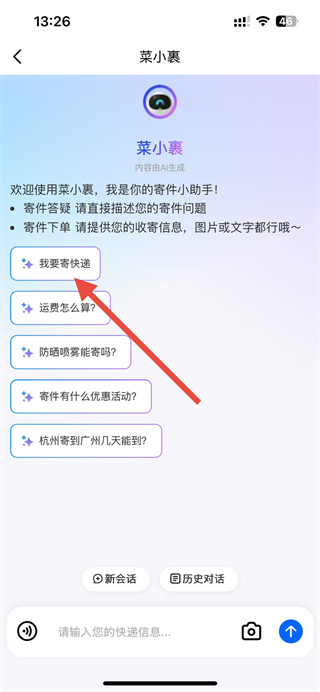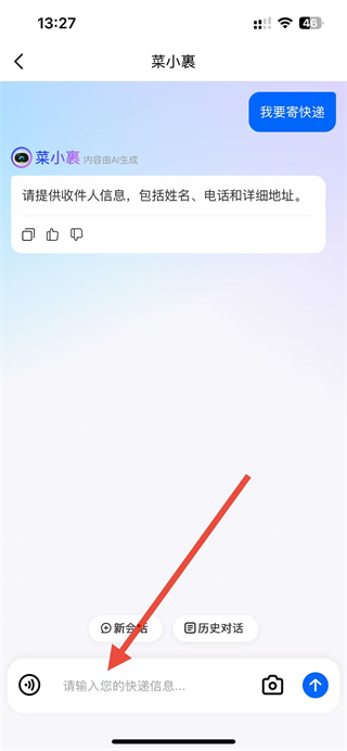 3、在菜小裹界面,点击我要寄快递按钮,触发AI寄件的信息填写流程。