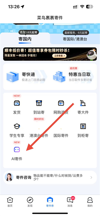 2、在寄件页面中,找到AI寄件选项并点击,进入菜小裹的AI交互界面。