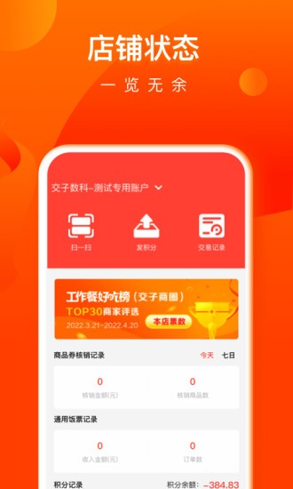 交子饭票商户软件最新版适合商家用户来使用,可以直接在手机上每天的店铺营业数据,可以通过扫一扫来进行优惠券的核销,可以在线进行结算,可以查看详细的交易记录,欢迎感兴趣的朋友下载体验!