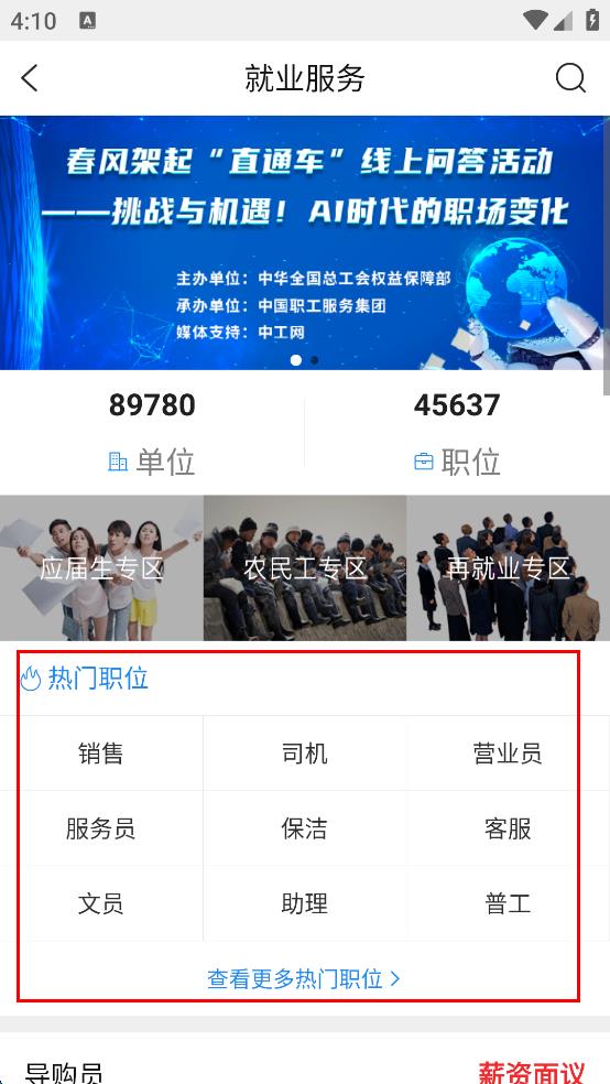 4、在就业服务页面,可查看热门职位等就业相关信息,还能根据自身需求,进一步浏览应届生专区、农民工专区、再就业专区等不同专区的内容。