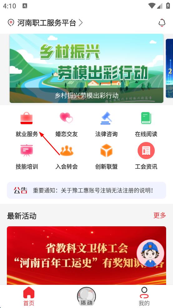 3、在河南职工服务平台主界面,找到“就业服务”选项并点击,进入就业服务页面。