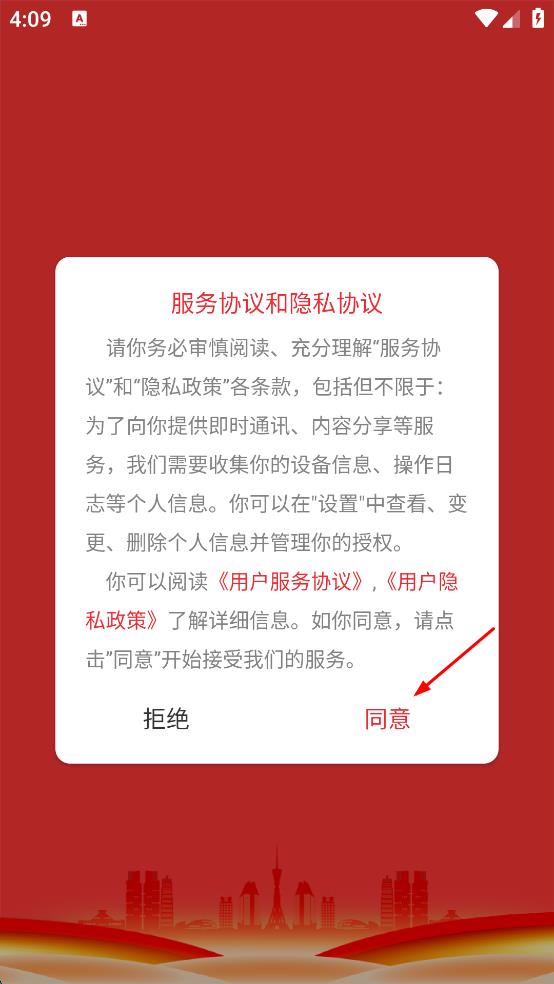 1、打开职工服务类应用,弹出服务协议和隐私协议提示框,仔细阅读相关内容后,点击“同意”按钮,进入职工服务中心列表页面。