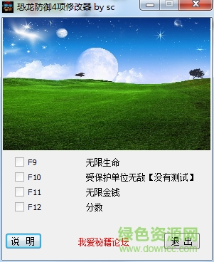 恐龙防御四项修改器是针对同名pc游戏玩家打造的一款辅助工具,使用修改器玩家可以一键修改游戏中的金钱、生命、分数等重要属性,合理的修改游戏参数可以帮助玩家轻松闯关,欢迎来绿色资源网下载!