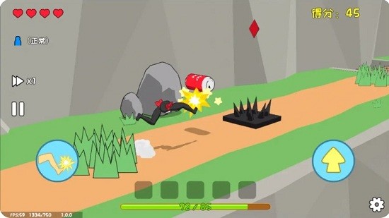 4、您要做的就是踢和跳;英雄克服了炸弹,洞穴,钓鱼钩等陷阱。用可乐罐跑到终点线。