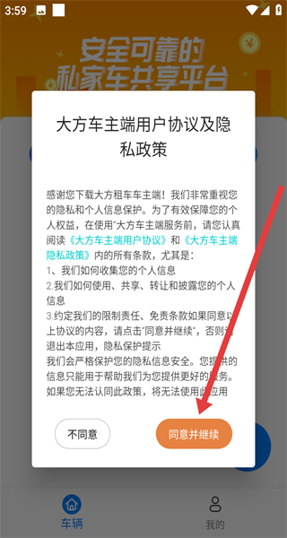 1、点击同意并继续按钮,同意大方车主端用户协议及隐私政策,进入APP主界面。