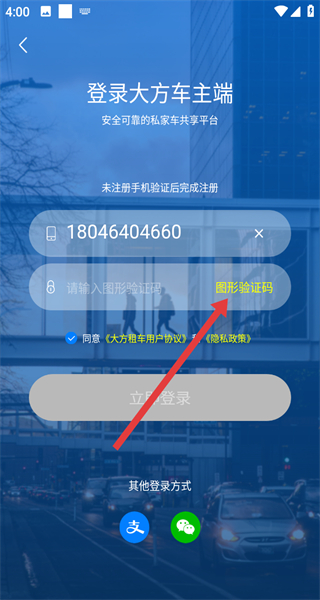 3、在登录界面,输入手机号码后点击图形验证码,输入图形验证码。
