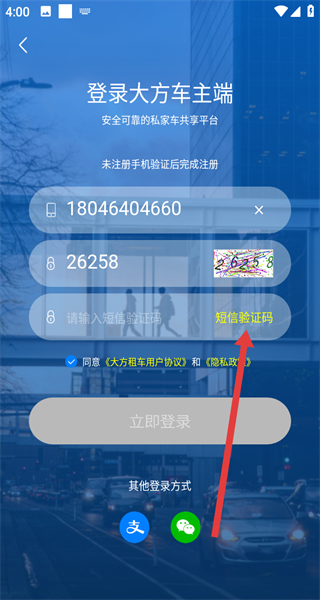 4、点击短信验证码,输入收到的短信验证码后,点击立即登录按钮,完成账号登录操作。