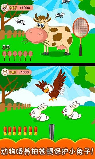 4、动物管理:动物管理小游戏,帮兔子逃脱老鹰追捕、帮奶牛驱赶蚊子;