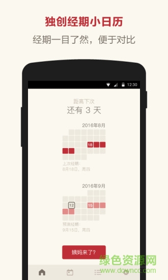 记录大姨妈月经期的日期,自动推算下次大姨妈月经期的日期、易孕期和排卵日。不再担心姨妈突然造访,毫无准备的尴尬,还可以监测自己的周期是否规律。