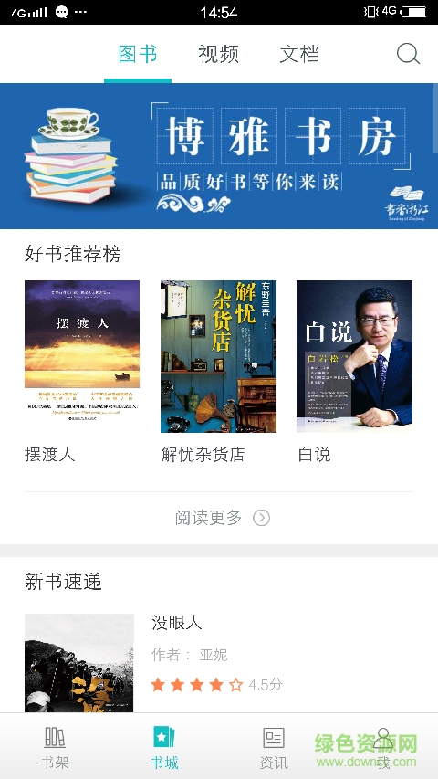 博雅书房app是一款学习阅读应用软件,丰富的书籍资源、热门的新闻资讯、焕然一新的读书风格让学习成为您生活乐趣的一部分,感兴趣的朋友来绿色资源网下载体验吧!