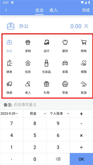 2、在记账页面,根据支出或收入类型,点击选择对应的图标,如出行、购物等。