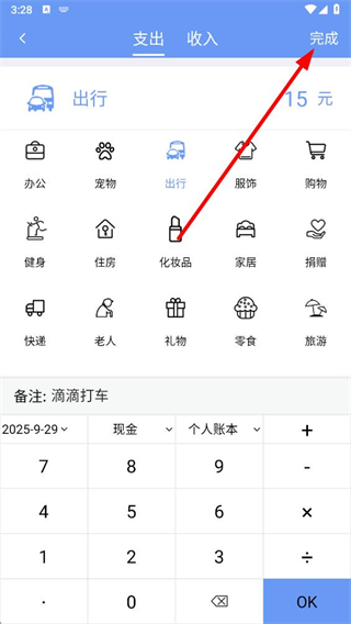 4、确认记账信息无误后,点击页面右上角的完成按钮,保存该笔记账记录。
