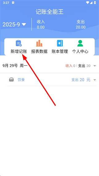 1、打开记账全能王app,在主界面点击新增记账按钮,进入记账页面。