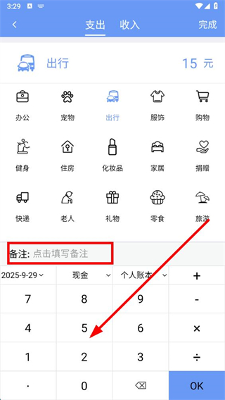 3、点击下方数字输入对应金额,若有需要,点击备注栏,填写消费用途或收入来源。
