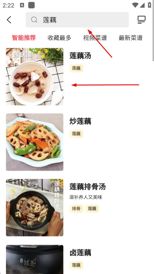 2、输入关键词后,界面会跳转显示相关菜谱列表,选择你感兴趣的菜谱。