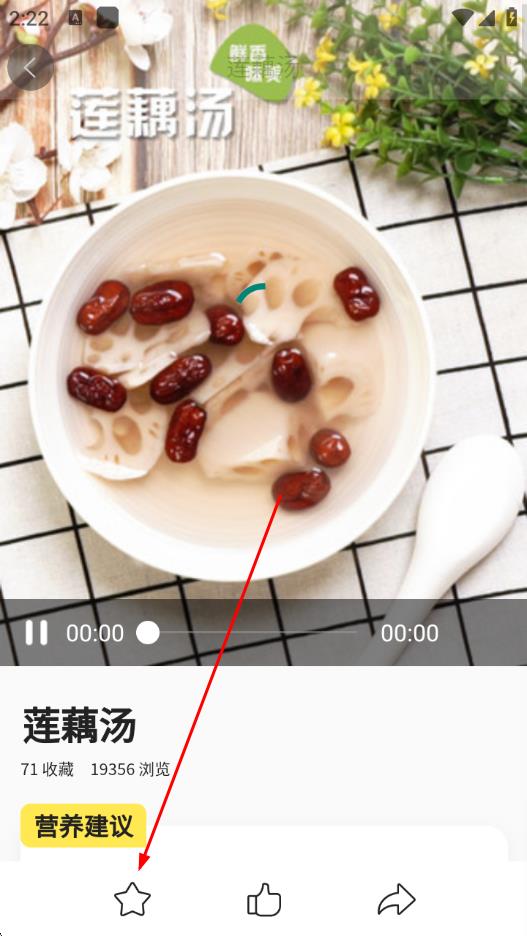 3、点击进入菜谱详情页,可看到下方有收藏图标,点击该图标,即可收藏。