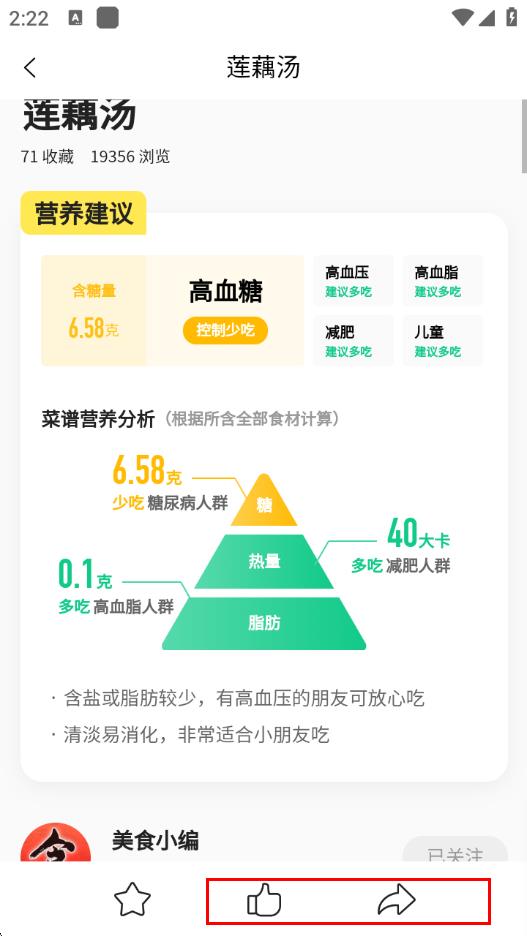 4、收藏成功后,在菜谱详情页能查看该菜谱针对不同人群的营养建议等内容,也可进行点赞、分享等操作。