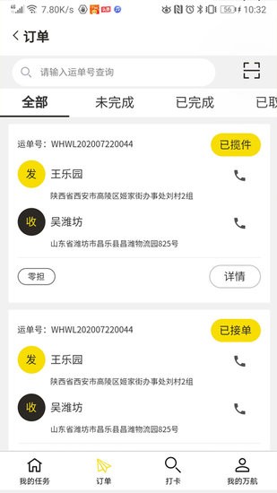 接单之后可以自主联系收货方,快捷扫码查询订单。