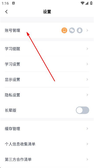 3、在设置页面中点击账号管理选项,进入账号管理页面。
