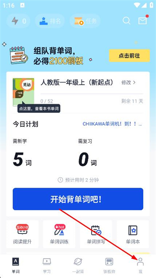 1、打开百词斩APP,点击页面底部导航栏最右侧的我选项。