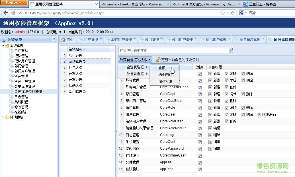 AppBox 是基于 FineUI 的通用权限管理框架,包括用户管理、职称管理、部门管理、部门用户管理、角色管理、角色用户管理、菜单模块管理、角色模块权限管理、日志管理、系统配置、在线统计等模块。