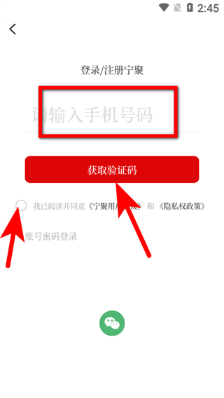 3、在登录注册页面,输入手机号码,勾选同意协议后点击获取验证码按钮。