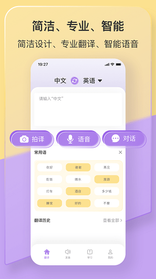 英文翻译软件,支持多种语言翻译,满足用户学习翻译、工作翻译、旅游翻译、旅行翻译、出国翻译需求。根据系统强大算法更支持拍照翻译、语音翻译,便捷精准不繁琐。