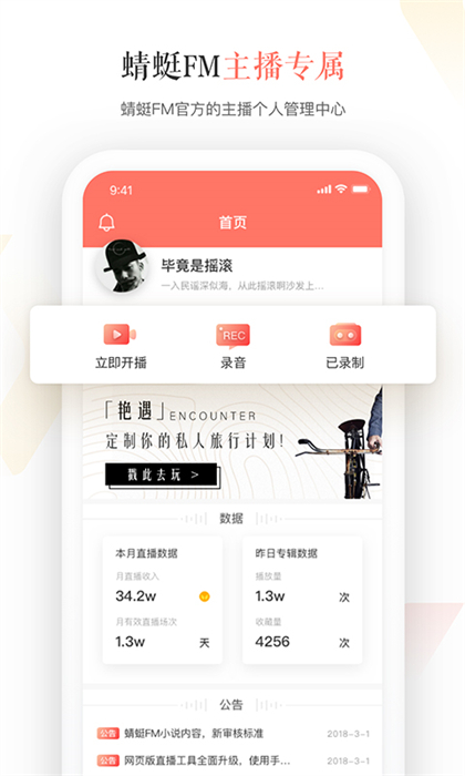 蜻蜓主播app是专为蜻蜓fm平台主播设计的一款直播管理软件,在线直播提供强大的节目录制功能,一键开播实时与粉丝互动,个人中心在线管理方便快捷,欢迎来下载!