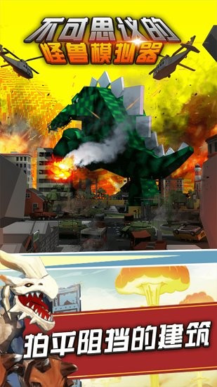 不可思议的怪兽模拟器采用独特的游戏画风加上全新的怪兽玩法带来不一样的指尖体验,简单的操作方式还有不同的怪兽选择以及各种建筑物等你来破坏,游戏上手容易还有各种炫酷的技能华丽的特效等等。喜欢的玩家赶紧来下载试试吧!